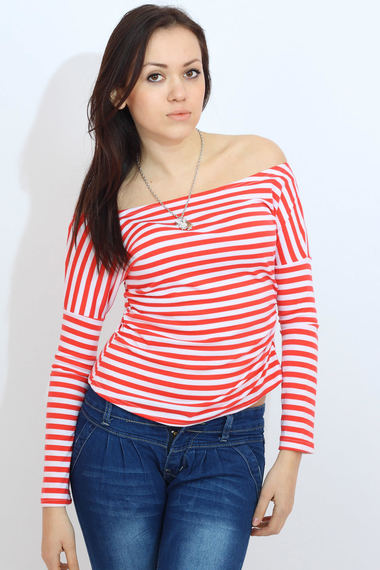 ОписаниеЗабавный топ в морской тематике из хлопковой ткани в красно-белую полоску. Модель с длинными рукавами, большим вырезом "лодочка" и открытым низом спинки, задрапированным черной резинкой.