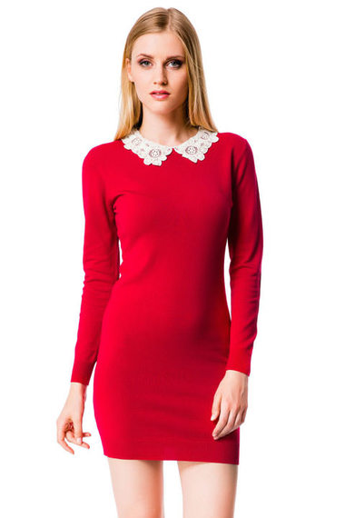 Красивое повседневное платье из малинового трикотажа. Модель с длинными рукавами, приталенная, украшена белым кружевным воротником. На спине есть небольшой вырез в форме капельки.