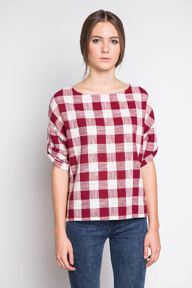 Оригинальная блузка в красно-белую клетку с рукавом 3/4. Модель свободного кроя, на рукавах имеются подхваты и пуговицы для изменения длины рукава.