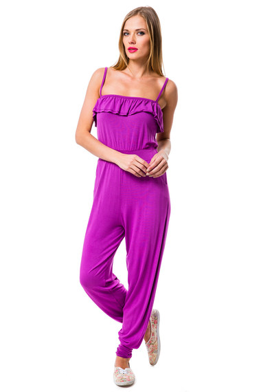 Яркий комбинезон из тонкой вискозы. Модель на тоненьких бретельках, брюки "шаровары" заканчиваются длинными манжетами, пояс-резинка и небольшие кармашки.