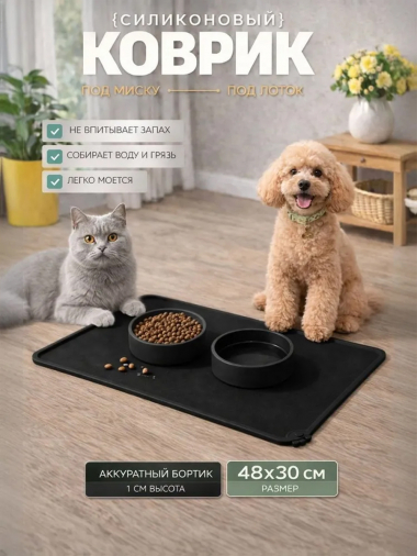 Коврик под миску для кошек и собак черный силиконовый 48х30см